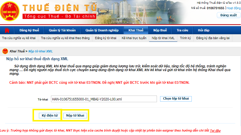 - Sau khi kết xuất XML thành công -> Các bạn truy cập vào trang "thuedientu.gdt.gov.vn" -> Đăng nhập bằng Chữ ký số của DN -> "Nộp Tờ khai" - > "Chọn Tờ khai" -> Ký điện tử rồi nộp. Lưu ý: Khi đăng nhập các bạn phải đăng nhập bằng MST-QL