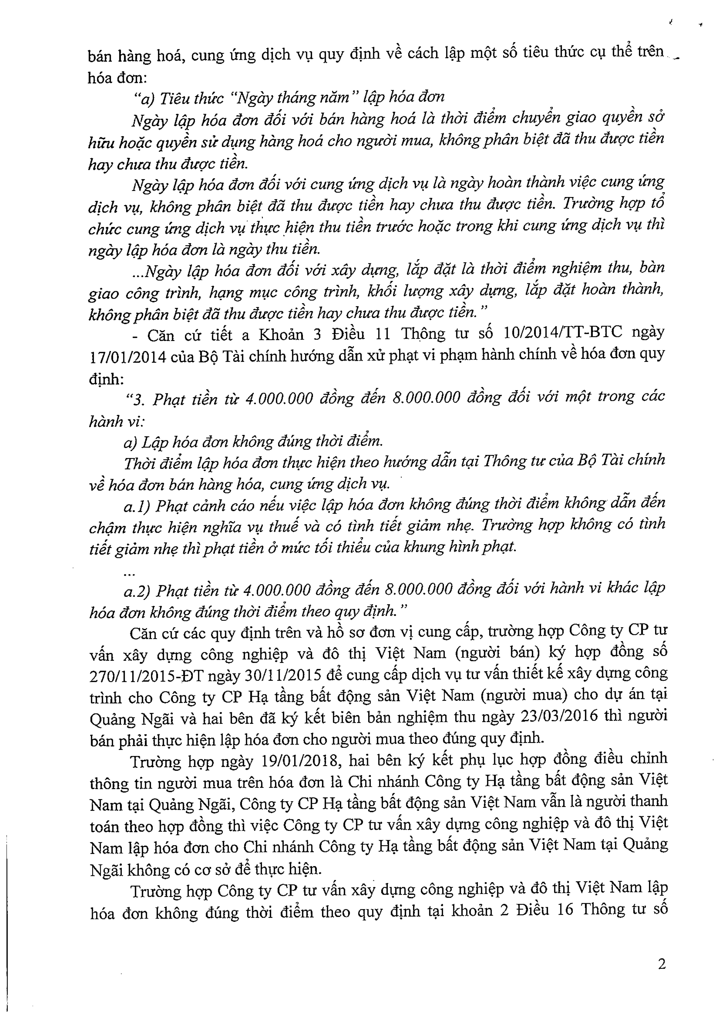 Ngày 02/04/2018, Tổng cục thuế - Cục thuế Thành phố Hà Nội ban hành công văn số 13405/CT-TTHT về việc lập hóa đơn. Theo đó, trường hợp công ty lập hóa đơn không đúng thời điểm theo quy định tại khoản 2, điều 16, thông tư số 39/2014/TT-BTC, thì bị phạt theo mức quy định tại tiết a, khoản 3, điều 11 thông tư số 10/2014/TT-BTC. Cụ thể như sau:
