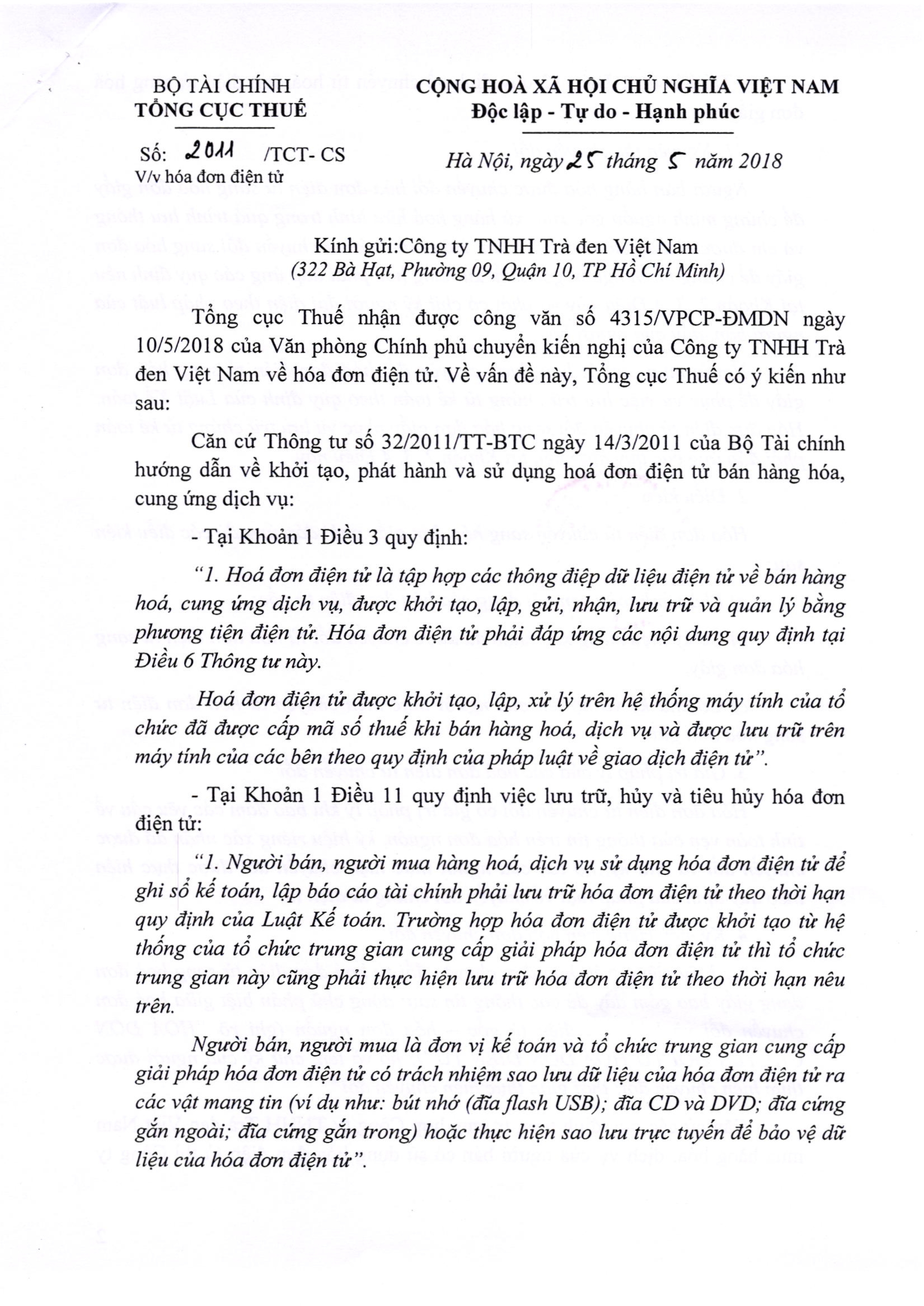 Công văn số 2011/TCT-CS của Tổng cục Thuế ngày 25/05/2018 v/v hoá đơn điện tử