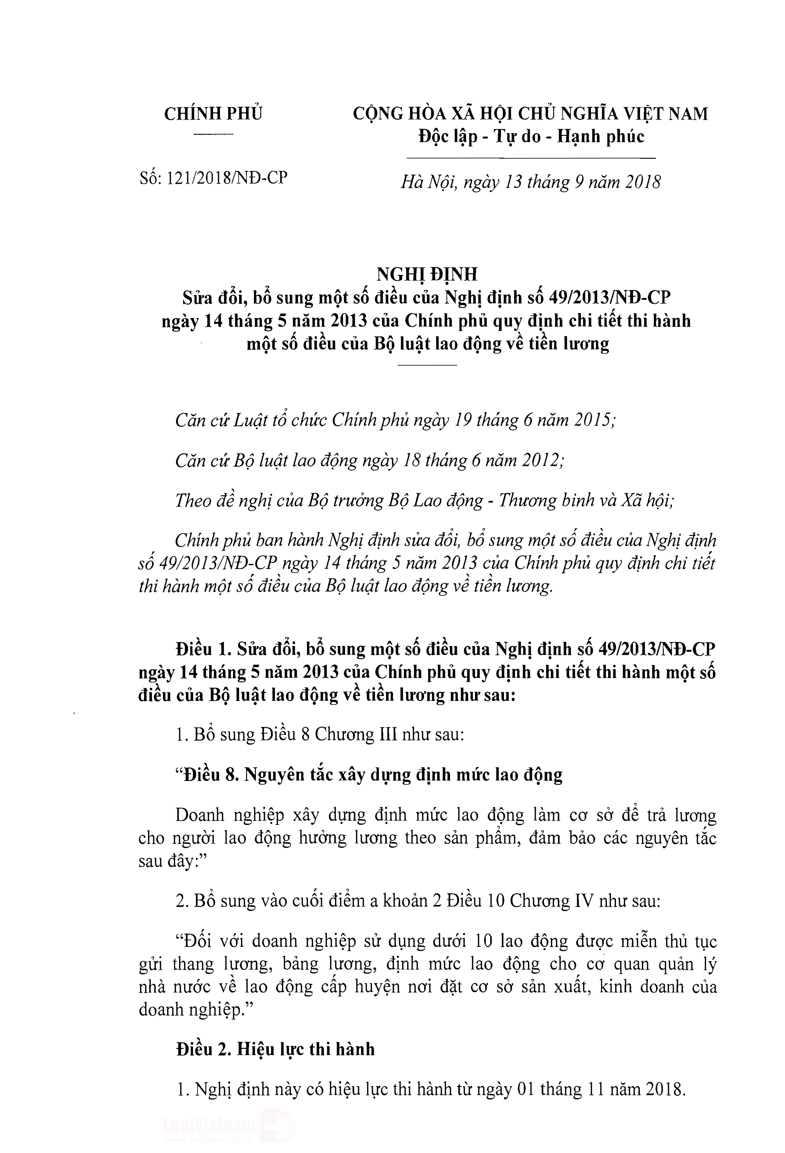 NĐ 121/2018/NĐ-CP SỬA BỔ SUNG NĐ 49/2013/NĐ-CP VỀ TIỀN LƯƠNG