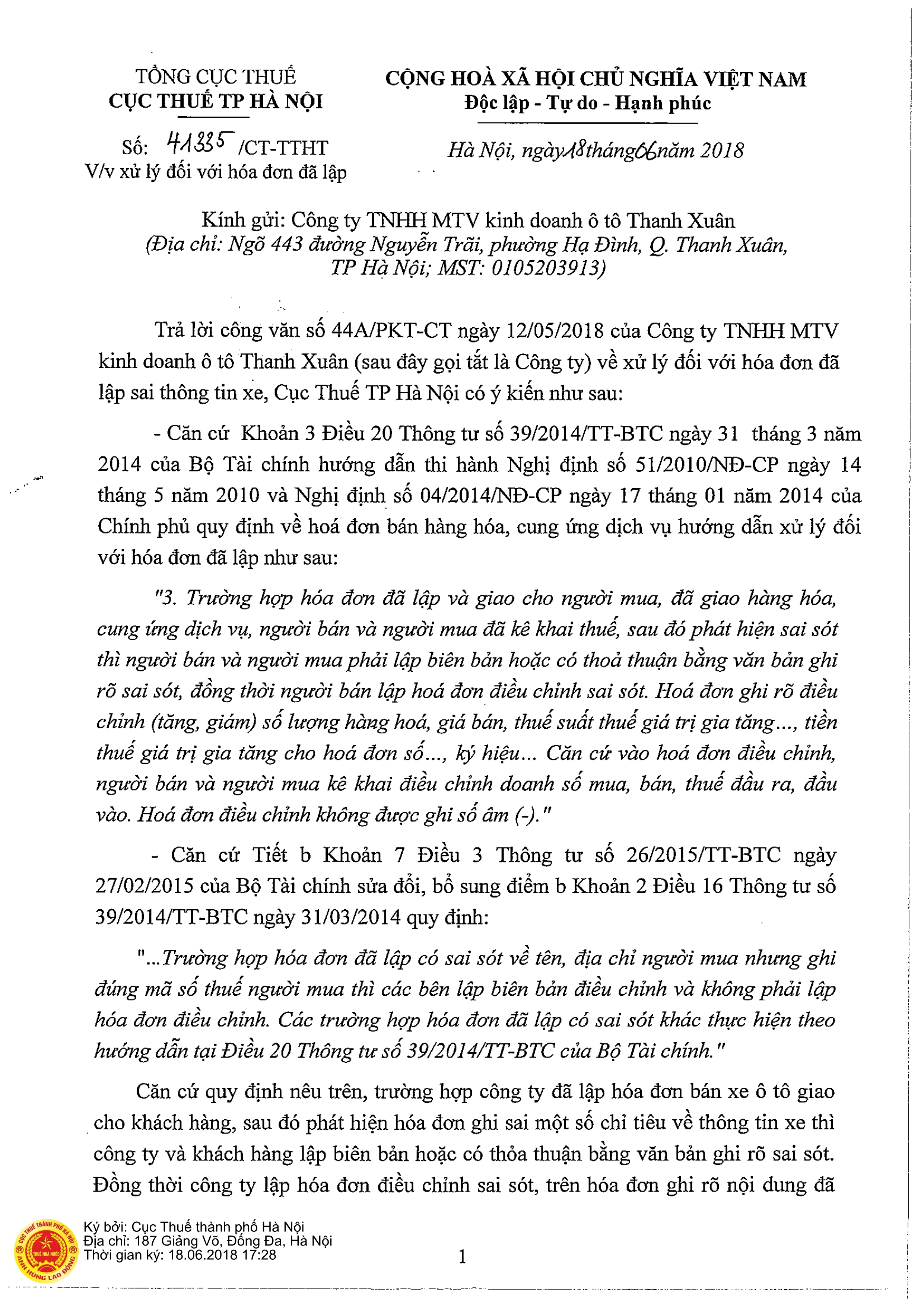 Công văn 41335/CT-TTHT do Cục thuế Hà Nội ban hành ngày 18/06/2018 về việc Xử lý hóa đơn đã giao khách hàng phát hiện ghi sai một số chỉ tiêu: